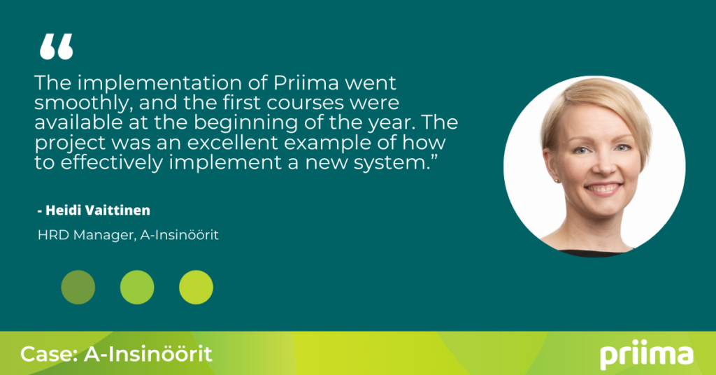The roll-out proceeded in clear steps and with good interaction, creating a strong basis for continuous service and joint development. Priima has been in effective use from the beginning, and it has been great to see how A-Insinöörit has involved more and more experts in the production of learning content,” says Henna-Riikka Ahvenjärvi, Account Manager at Saarni Learning.