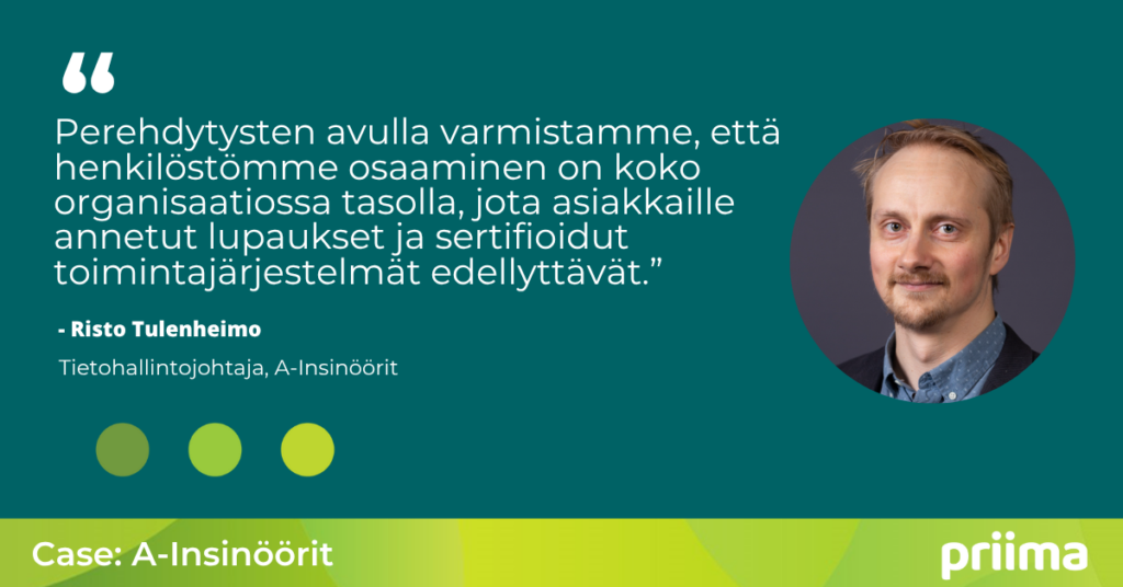 – Priima met our needs very well. We work as experts on demanding customer projects and operate in accordance with high quality, environmental and security systems. Through training, we ensure that the skills of our staff throughout the organisation are at the level required to deliver the promises made to our customers and the certified operating systems. With Priima, we can also provide the same training to our subcontractors,” says Risto Tulenheimo, Director of Information Management, responsible for A-Insinieure’s day-to-day IT services and security.